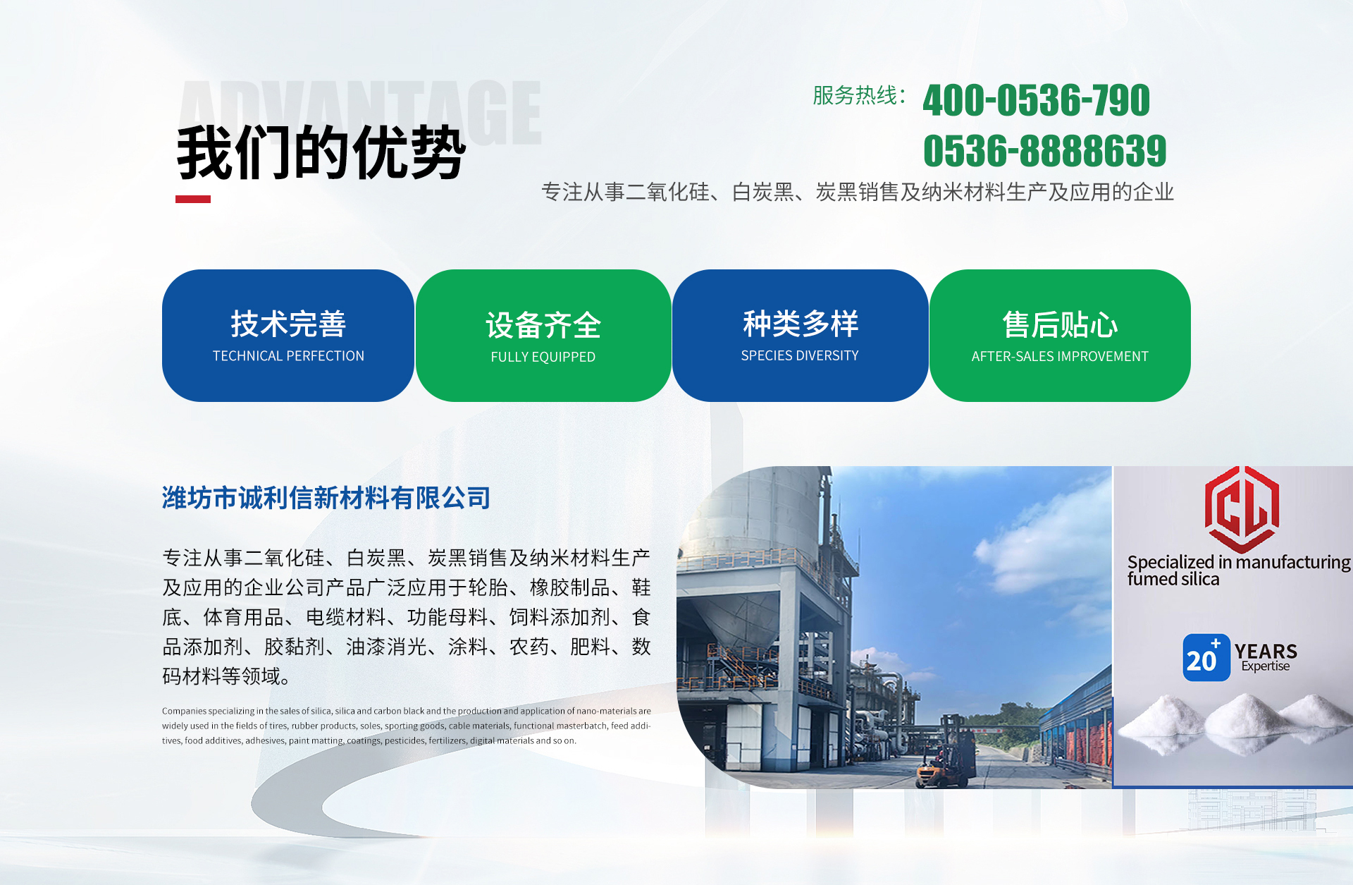 潍坊市诚利信新材料有限公司位于山东省潍坊市青州市,是一家专注从事二氧化硅、白炭黑、炭黑销售及纳米材料生产及应用的企业;公司经营的产品型号及种类齐全,公司产品广泛应用于轮胎、橡胶制品、鞋底、体育用品、电缆材料、 功能母料、饲料添加剂、食品添加剂、胶黏剂、油漆消光、涂料、农药、肥料、数码材料等领域。公司本着“创造价值,合作共赢,服务至上,持续发展”的企业宗旨,不断完善自我,追求发展。真心服务于广大客户。公司产品除内销外,现外销国外多个地区,并赢得了国内外客户的一致好评!真诚欢迎各界朋友与我公司洽谈合作,共同发展,共创未来!